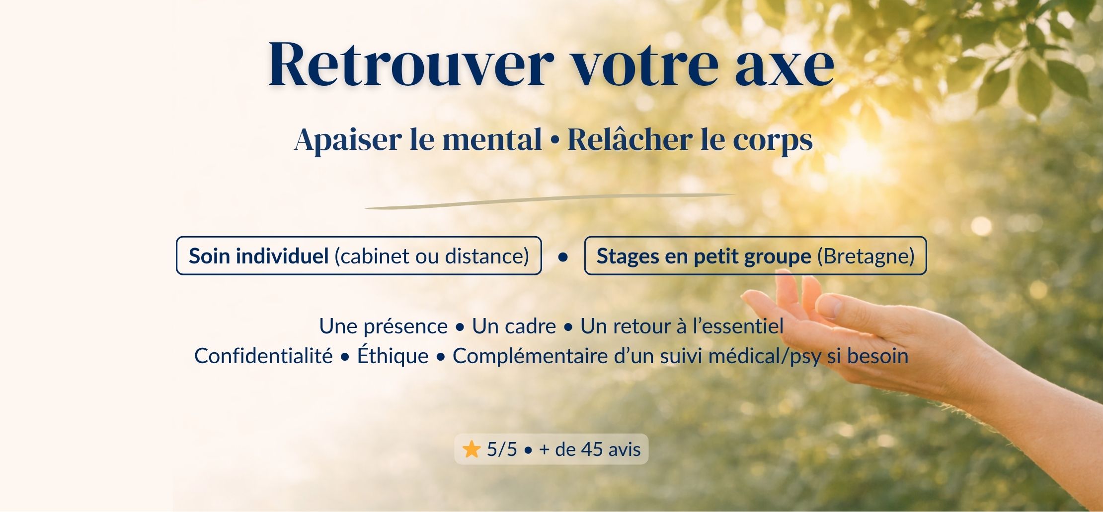 Je vous accueille dans un espace de présence, d’écoute subtile et de transformation douce, respectueux de votre rythme.