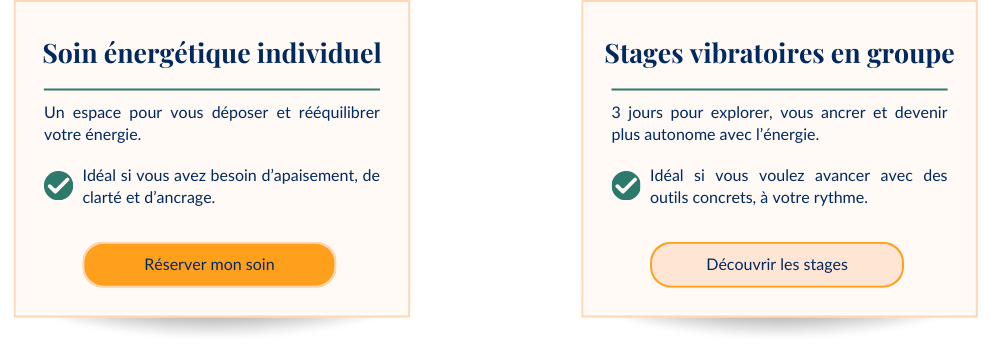 “Que ce soit en soin ou en stage, l’essentiel est le même : un cadre, une présence et un retour au centre, à votre rythme.”
