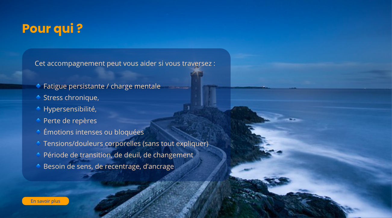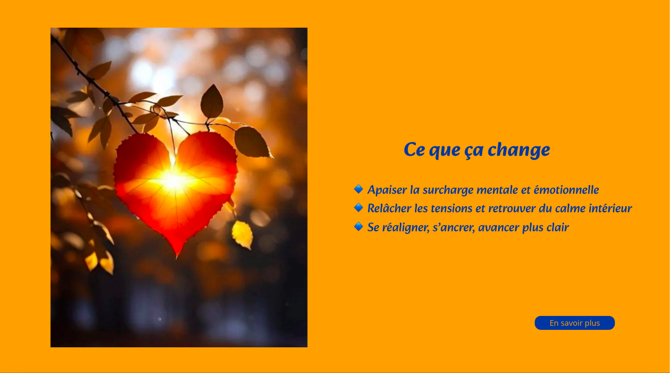 J’ouvre un espace de présence, d’écoute subtile et de transformation douce.